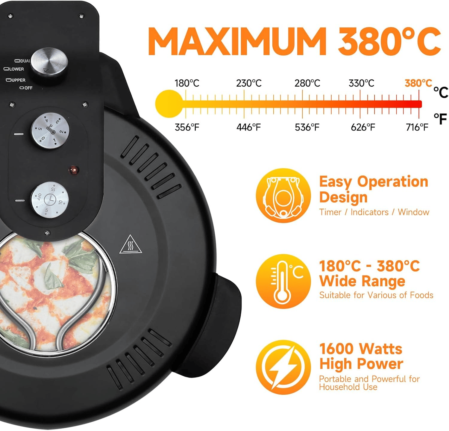 ★ [Upgraded Timer&Window & Thermometer] Dual control knob power and time, cooking is convenient and fast, you can set them separately according to your cooking habits. A visual window at the top allows you to keep an eye on the status of your pizza at all times. The built-in temperature detector can accurately display the temperature without the use of a thermometer. Therefore, you will have more control over your pizza cooking.