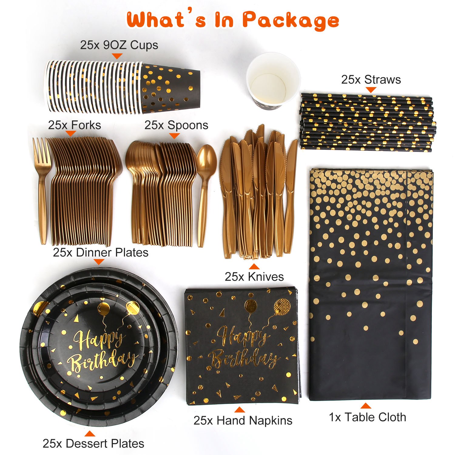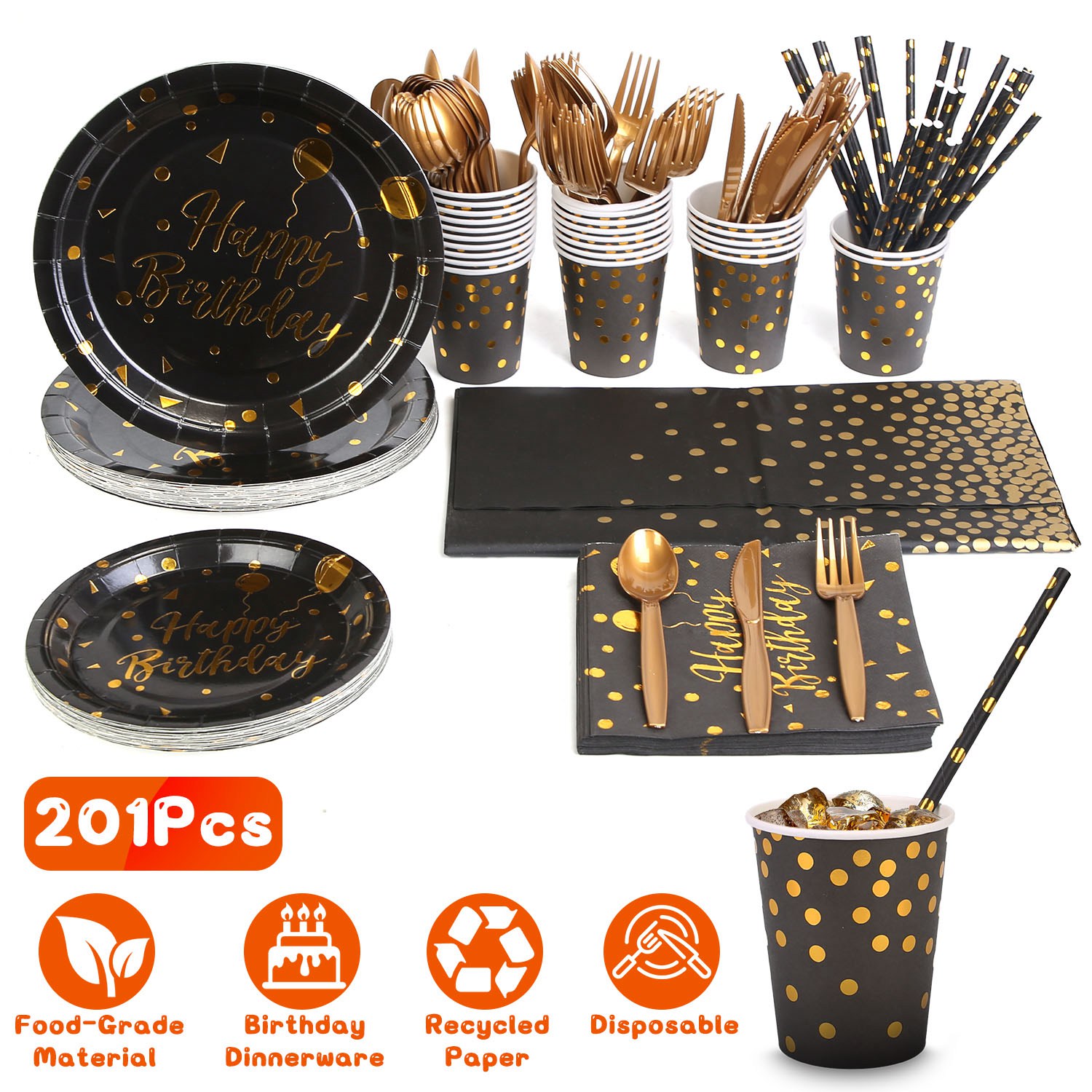 201PCS Black Gold Birthday Party Supplies For 25 Guests Happy Birthday Disposable Dinnerware Set Paper Plates 9OZ Cups Straws Napkins Forks Knives Spoons