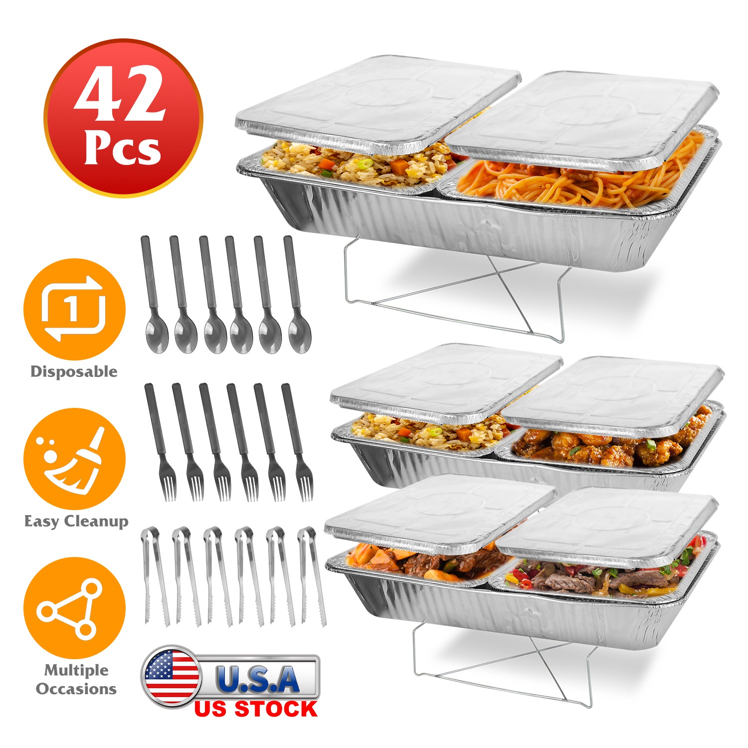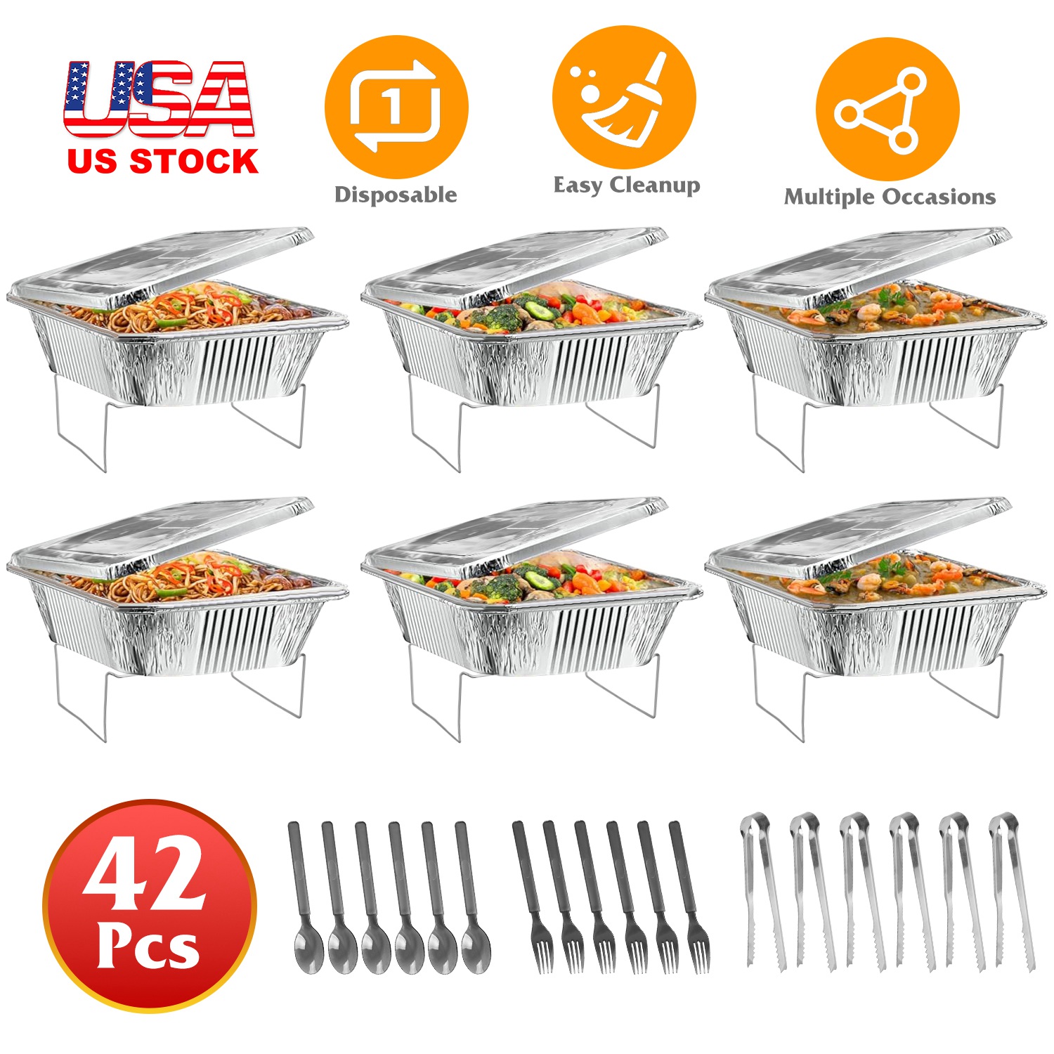 42Pcs Disposable Chafing Dish Buffet Set Chafing Servers with Covers Spoons Forks Tongs Full-Size Pans Food Warmers for Parties Events Catering Supplies