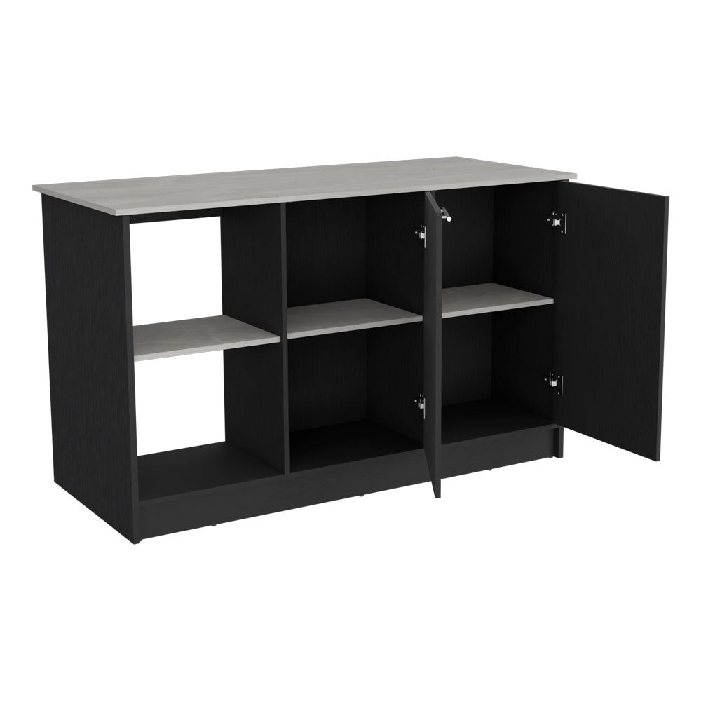 Meet the Kitchen Island Padua, where culinary finesse meets stylish functionality. Crafted with the modern chef in mind, it showcases a generous 59" W x 25.1" D countertop, making meal prepping a delight or even moonlighting as a chic dining table. Dual open storage shelves, each measuring 14.8"H x 17.2"W, keep ingredients or utensils within easy reach. Complementing this is a double-door cabinet, thoughtfully designed with inner shelves to tuck away cookware or groceries. All are elegantly framed in durable white/light oak, black/macadamia, black/onyx or white/onyx manufactured wood finishes.Dimensions:Height: 35,4" Width: 59'Depth: 25,1'Furniture Type: Ready to assemble (full assembly required).Certifications: CARB phase II compliant – TSCA Title VI Compliant.Warranty: 1-year warranty coverage in wooden parts- 1-year warranty coverage in hardware pieces since its manufacturing date found in the lot number printed in the product box.