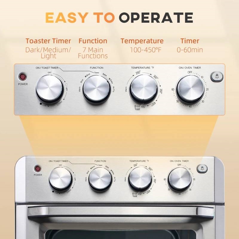 This Silver Multi-Function 7-in-1 Toaster Oven 21 QT features 7 functions - warm, broil, convection broil, toast, bake, convection bake and air fryer to meet your daily cooking needs. You can easily control the temperature of this conventional oven from 100 F - 450 F and cooking time from 0-60 minutes according to your needs. 3 toasted shade options in light, medium and dark can be selected by switching the toaster timer button. The built in light and glass viewing window allow you to observe the process and 3 rack positions let you cook different kinds of food at once in this convection oven. This 4 slice toaster oven provides ample room for 4 slices of bread or up to a 9"pizza while saving space in your kitchen. Feature 1 x fry basket, 1 x oven rack, 1 x baking pan, and 1 x crumb tray to make different delicious food